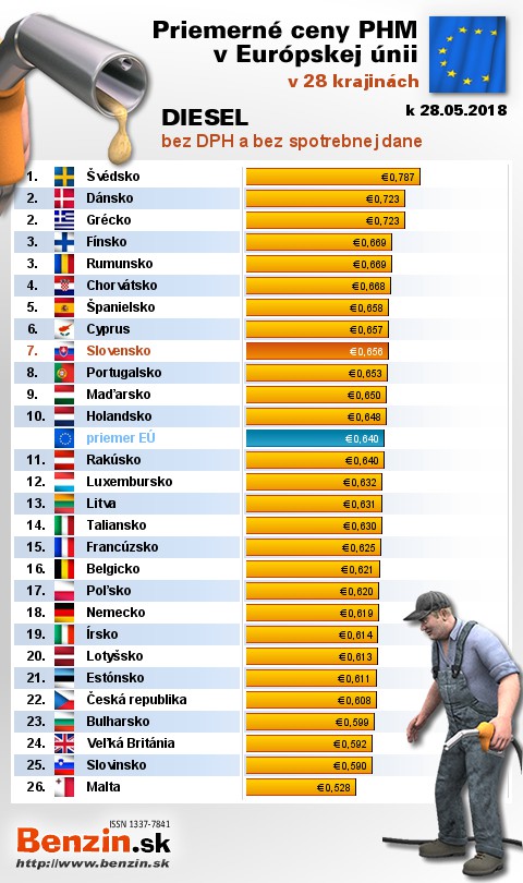 Na Slovensku čerpali motoristi 20. najlacnejšiu motorovú naftu bez dane v rámci Európy: 0,656 EUR za 1L.
