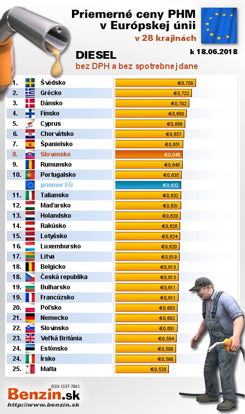 Na Slovensku čerpali motoristi 18. najlacnejšiu motorovú naftu bez dane v rámci Európy: 0,646 EUR za 1L.