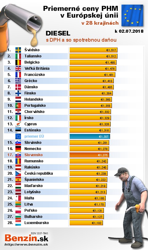 Na Slovensku čerpali motoristi 17. najdrahšiu motorovú naftu s daňou v rámci Európy: 1,275 EUR za 1L.