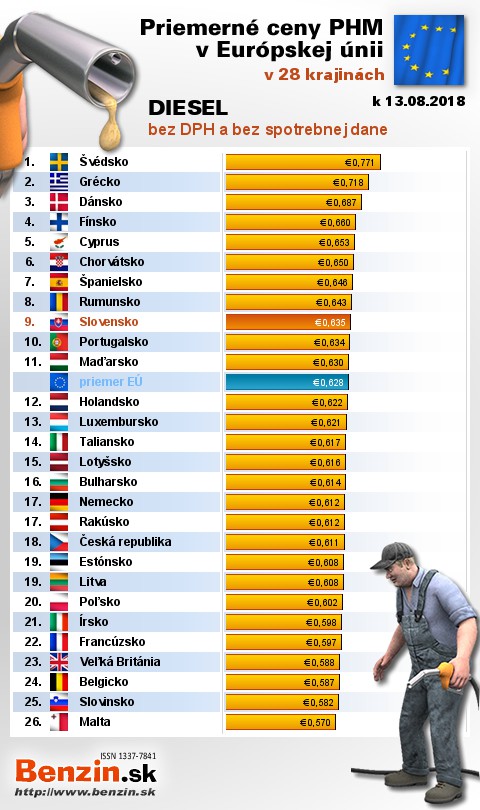 Nasledujúce údaje sú spracované podľa informácií EUROSTATU vydaných 16.08 k 13.08.2018 za obdobie v 32.týždni (od 06.08.2018 - 12.08.2018), ako ich uviedli členské štáty EU. Ceny sú uvádzané v euro. V tabuľke uvádzame štáty Európy podľa toho, za akú priemernú sumu v predchádzajúcich dňoch tankovali.