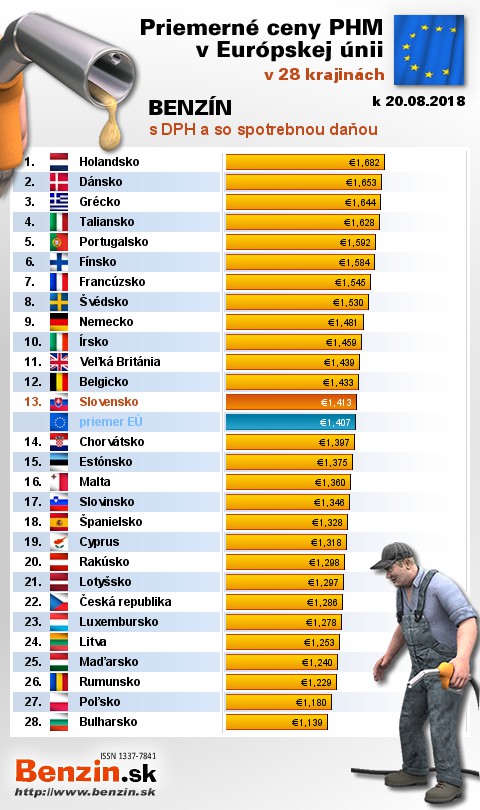 mali v Holandsku, kde motoristi v priemere zaplatili 1,682 EUR za 1L.