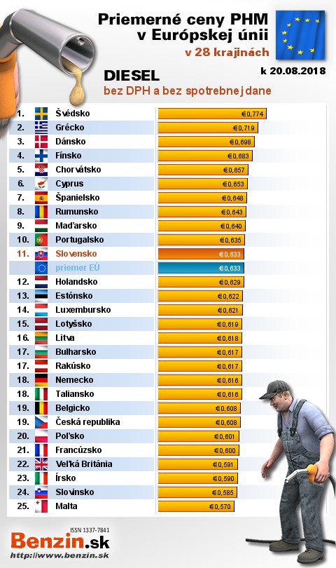 Na Slovensku čerpali motoristi 15. najlacnejšiu motorovú naftu bez dane v rámci Európy: 0,633 EUR za 1L.