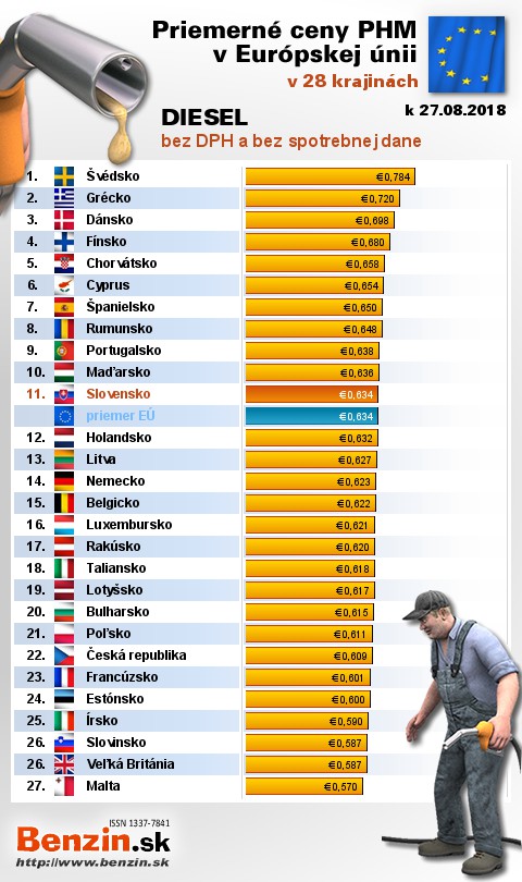 Na Slovensku čerpali motoristi 17. najlacnejšiu motorovú naftu bez dane v rámci Európy: 0,634 EUR za 1L.