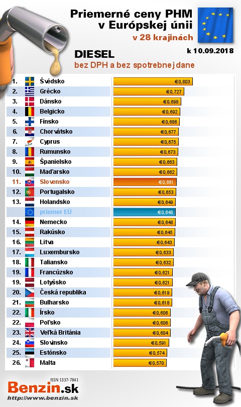 Na Slovensku čerpali motoristi 16. najlacnejšiu motorovú naftu bez dane v rámci Európy: 0,661 EUR za 1L.