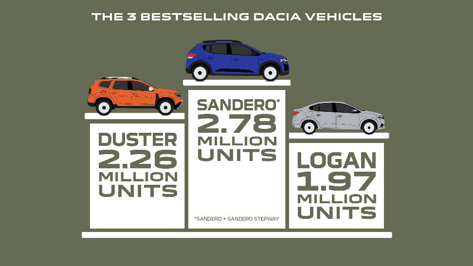 Vďaka svojmu sortimentu a najpredávanejším modelom dosiahla Dacia do roku 2023 symbolickú hranicu 8 miliónov predaných kusov. V rozdelení podľa modelov to predstavuje 2,78 milióna Dacia Sandero, 2,26 milióna Dacia Duster, 1,97 milióna Dacia Logan, 630 000 Dacia Dokker, 346 000 Dacia Lodgi, 93 000 Dacia Spring, 80 000 Dacia Jogger, 56 000 Dacia Pick-up a 51 000 Dacia Solenz.