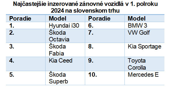 Najčastejšie inzerované zánovné automobily sú značiek Hyundai s modelom i30, Kia s modelmi Ceed a Sportage či česká značka Škoda s modelmi Octavia, Fabia a Superb. Väčšina ponúkaných zánovných áut má benzínový motor (43 %), ale významne narástla aj ponuka alternatívnych palív. Posledný polrok si mohli Slováci vyberať z viac ako trojnásobného množstva zánovných, čisto batériových vozidiel (konkrétne 607) a hybridov (747) v porovnaní s predošlým polrokom. Z elektromobilov je najviac inzerovaná Tesla Model 3 a z hybridov Toyota Corolla.