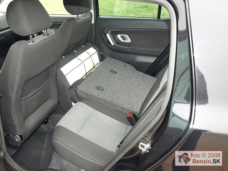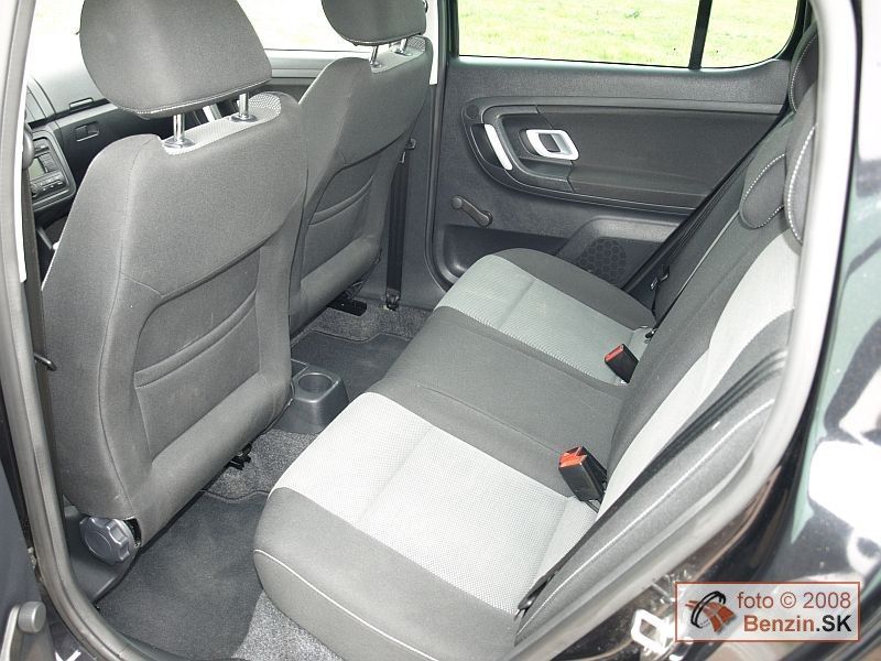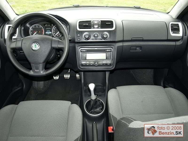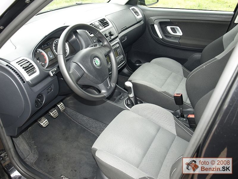 Tvar a vybavenie interiéru zodpovedá Škode Roomster. V našom prípade bolo čalúnenie tmavo sivé, skoro čierne, oživené na sedadlách bielymi bodkami. Oproti štandardu mali sedadlá športové tvarovanie, ktoré skutočne dobre držalo telo aj pri prudšom prejazde zákrutami. Ďalej kožený, v dvoch rovinách nastaviteľný volant, hliníkové pedále, automatickú klimatizáciu, palubný počítač, ale aj štandardne elektricky ovládané okná a zrkadlá. Očakávaná dynamickejšia jazda sa môže oprieť už o tradične dobrý podvozok. Ten má nielen presné vedenie, ale dobre tlmí aj rázy od kolies na menej kvalitných cestách. V trochu väčšej miere sa motor ozýva do interiéru až pri diaľničnej rýchlosti, inak ostáva interiér pokojný. Praktické zostalo aj využitie batožinového priestoru, aj keď na úplné sklopenie operadiel musíte najprv demontovať opierky hlavy.