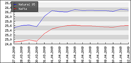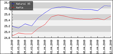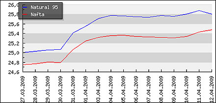 | | Nafta: | 1,771 € | | Benzin 95: | 1,697 € | | Benzin 95+: | 1,693 € | | Benzin 99+: | 1,866 € | | LPG: | 0,869 € |