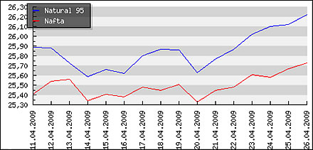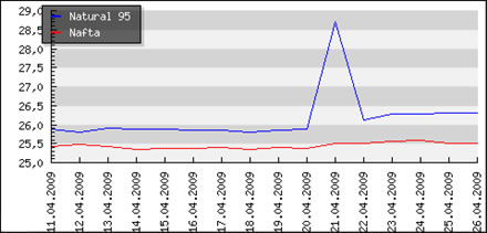 | | Nafta: | 1,762 € | | Benzin 95: | 1,697 € | | Benzin 95+: | 1,686 € | | Benzin 99+: | 1,865 € | | LPG: | 0,870 € |