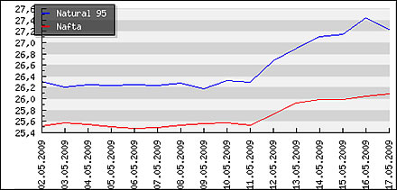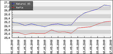 | | Nafta: | 1,472 € | | Benzin 95: | 1,490 € | | Benzin 95+: | 1,500 € | | Benzin 99+: | 1,613 € | | LPG: | 0,640 € | | AdBlue: | 0,890 € |