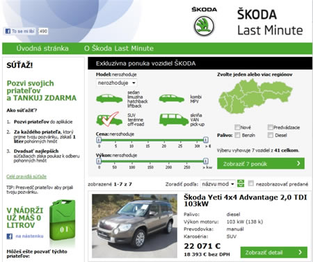 Spoločnosť ŠKODA AUTO Slovensko ako jediná na Slovensku využíva sociálnu sieť Facebook na predaj automobilov. Od 26. septembra do 10. októbra si tu ktokoľvek môže vybrať niektoré z ponúkaných skladových vozidiel, ktoré sa nedajú kúpiť žiadnym iným spôsobom.