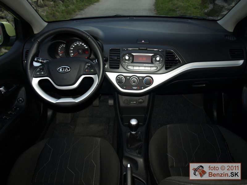 Počas testu sme si ľahko zvykli na to, že vnútorné vybavenie pripomína skôr väčšie a drahšie auto. Klimatizáciu, palubný počítač, elektrické ovládanie okien a zrkadiel, sme brali ako samozrejmosť, podobne ako v smere aktívnej, či pasívnej bezpečnosti systém ESP a sedem airbagov. Autorádio má vstup USB, ale aj ovládanie aj na koženom multifunkčnom volante, ktorý má však len výškové nastavovanie. Automobil sa štartuje bez kľúča, tlačidlom a otváranie dverí je tiež založené na tom, že ovládaciu škatuľku máte vo vrecku a automobil vás podľa toho identifikuje. Treba vziať do úvahy, že sedenie je veľmi pohodlné nielen na predných, ale aj zadných sedadlách.. Určité obmedzenie predstavuje v poňatí rodinného využitia len 200 litrový kufor. Výbornou devízou automobilu Kia Picanto je veľmi dobré dielenské spracovanie, vyzretý a nápaditý dizajn a jazdný komfort najmenej o stupeň vyššie zaradeného auta.