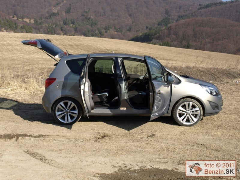 Teraz už konštruktéri zjavne nevychádzali len z maximálne využiteľného vnútorného priestoru, ktorý ich priviedol k rovnakej myšlienke. Opel Meriva síce rozmerovom v minulom roku narástla, ale priniesla viacero až prekvapivých prvkov, ktoré ju stavajú do iného svetla. Na prvý pohľad sú to bočné dvere, ktoré sa otvárajú netradične proti sebe. To umožňuje najmä pasažierom na zadných sedadlách príjemnejšie nastupovanie. Zatváranie zadných dverí je však pre nich netradičné, musia si naň zvyknúť. Z dizajnérskeho hľadiska je bočný pohľad osviežený poklesom bočnej línie v oblasti zadných okien. Automobil nielen osviežuje, ale zabezpečuje aj dynamickejšie línie. Pohľad spredu Merivu jednoznačne zaraďuje do rodiny Opel, zadná časť zasa opticky odľahčuje karosériu.