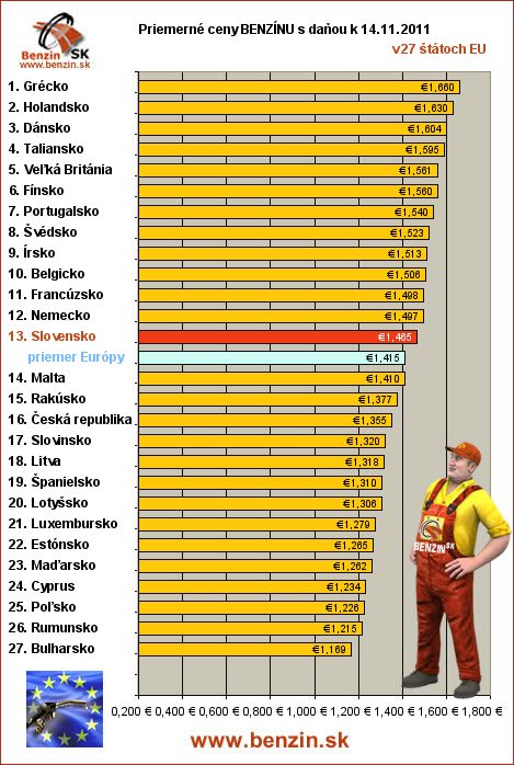 Na Slovensku sme tankovali 13. najdrahší benzín s daňou v EÚ za priemernú cenu: 1,465 EUR za 1L.