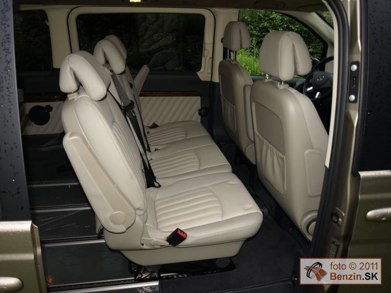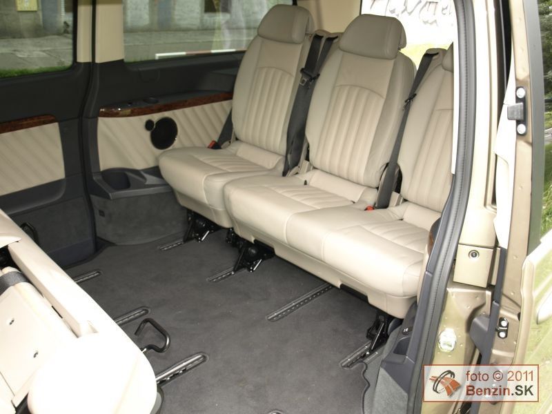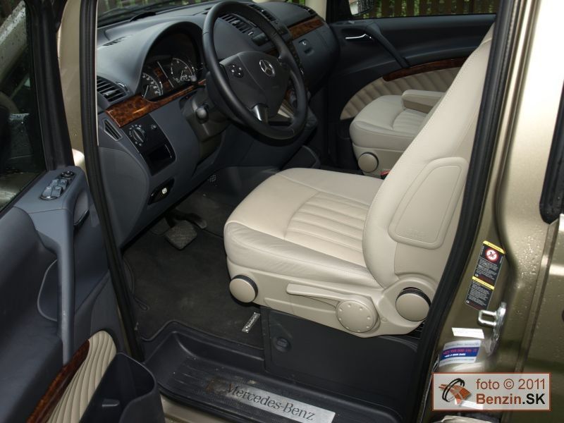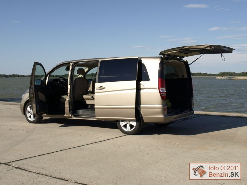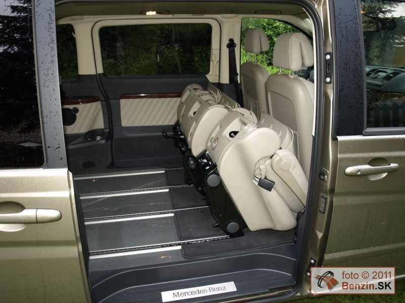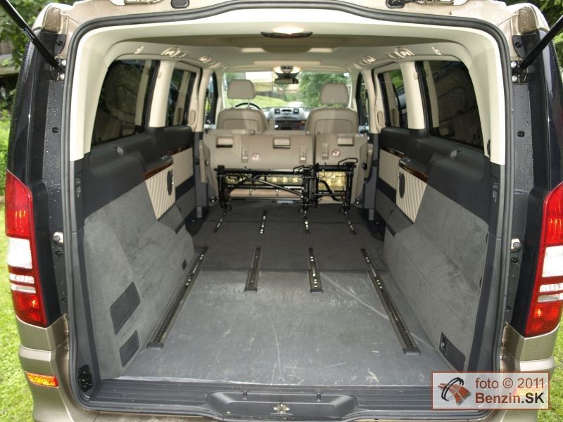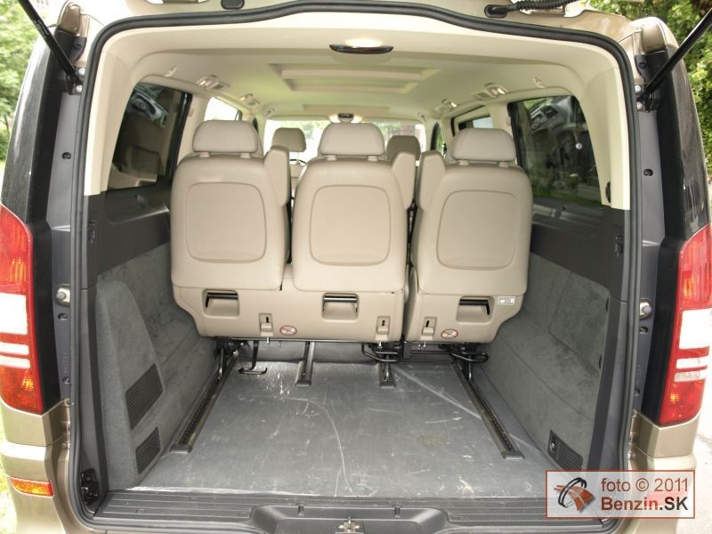 Treba dodať, že Viano sa dodáva aj dvomi typmi kratších karosérií. Keďže sme mali najväčšiu, oddávali sme sa jej priestorovým možnostiam, a tie sú ohromné. Na batožinu aj za tretím radom sedadiel je k dispozícii skoro jeden meter kubický. Nestačí? Sedadlá sa dajú ľahko vybrať z automobilu. Nuž ľahko idú tie tretinové. Dvojité sú už pre jedného príliš ťažké, potrebujete ešte jeden pár rúk. No potom sa Viano zmení na "telocvičňu" s viac ako štyri a pol metrami kubickými priestoru, kde nezavadzia ani rezerva. Tá je umiestnená pod automobilom, zvonku, hneď za poháňanou zadnou nápravou. Prístup cez bočné posuvné dvere je dobrý aj na tretí rad sedadiel. Nastupuje sa do výšky, takže problémy nemajú ani pasažieri s boľavými krížami.