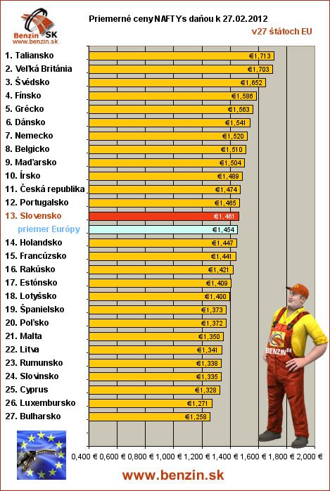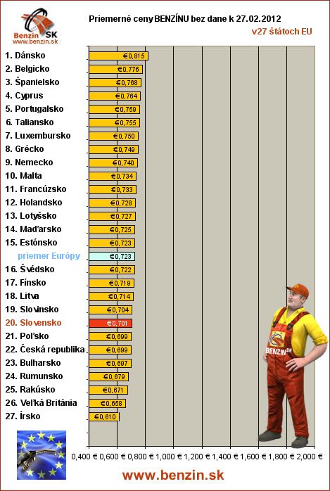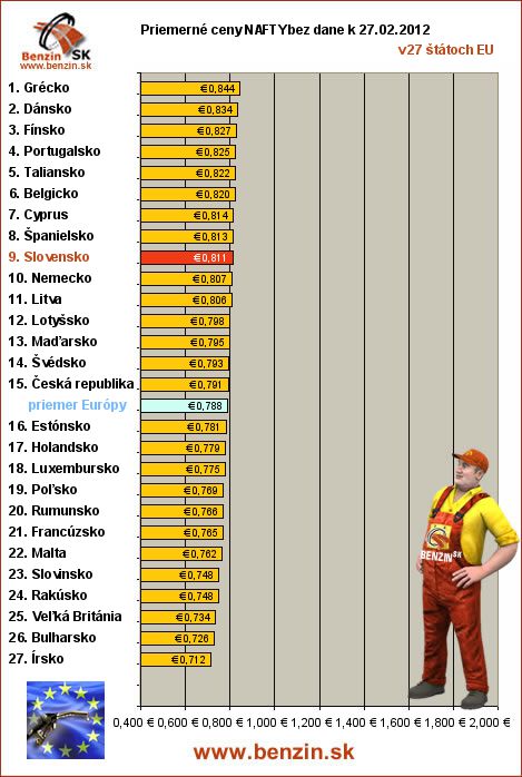 Nasledujúce údaje sú spracované podľa informácií EUROSTATU vydaných 02.03 k 27.02.2012 za obdobie v 8.týždni (od 20.02.2012 - 26.02.2012), ako ich uviedli členské štáty EU. Ceny sú uvádzané v euro. V tabuľke uvádzame štáty Európy podľa toho, za akú priemernú sumu v predchádzajúcich dňoch tankovali.