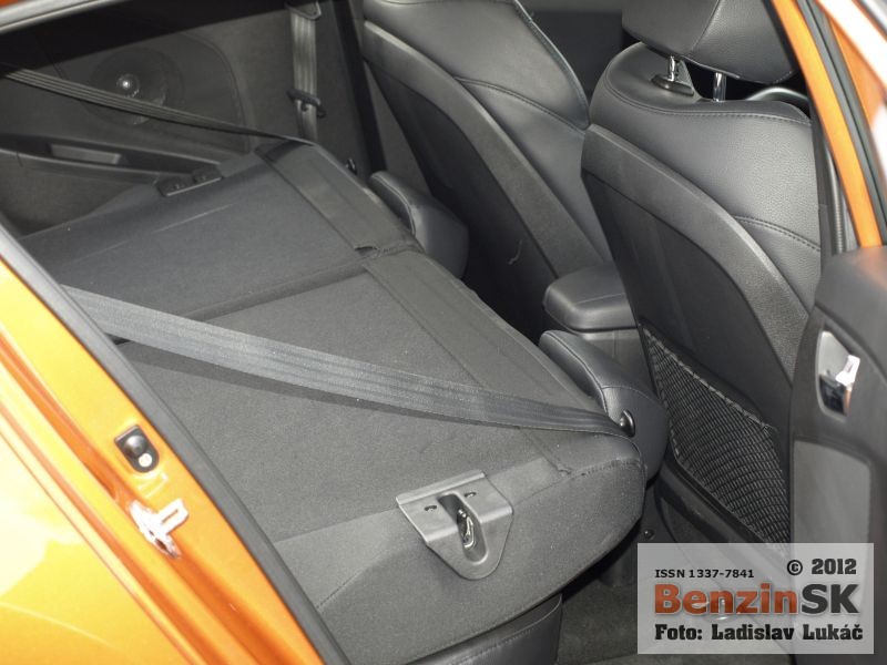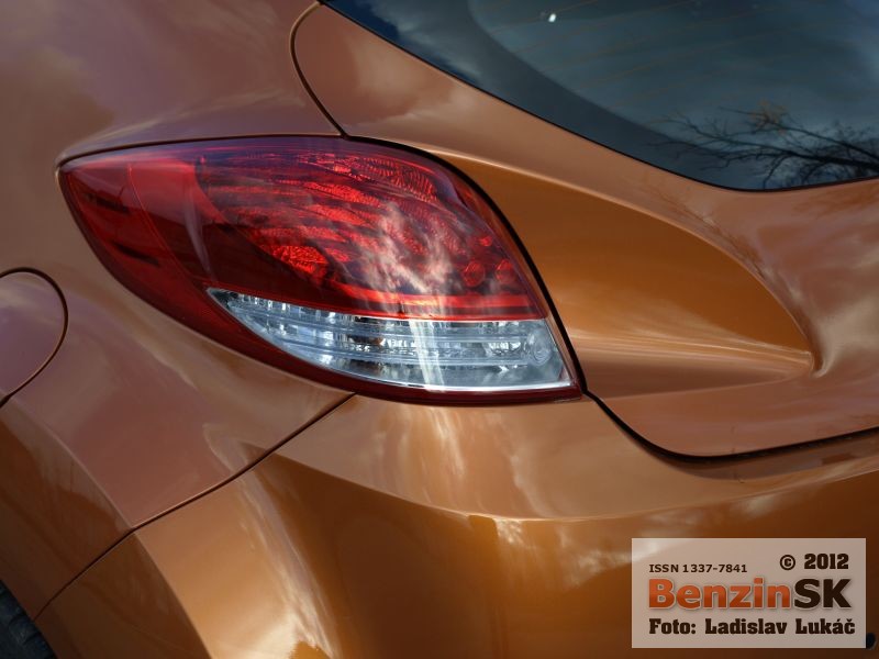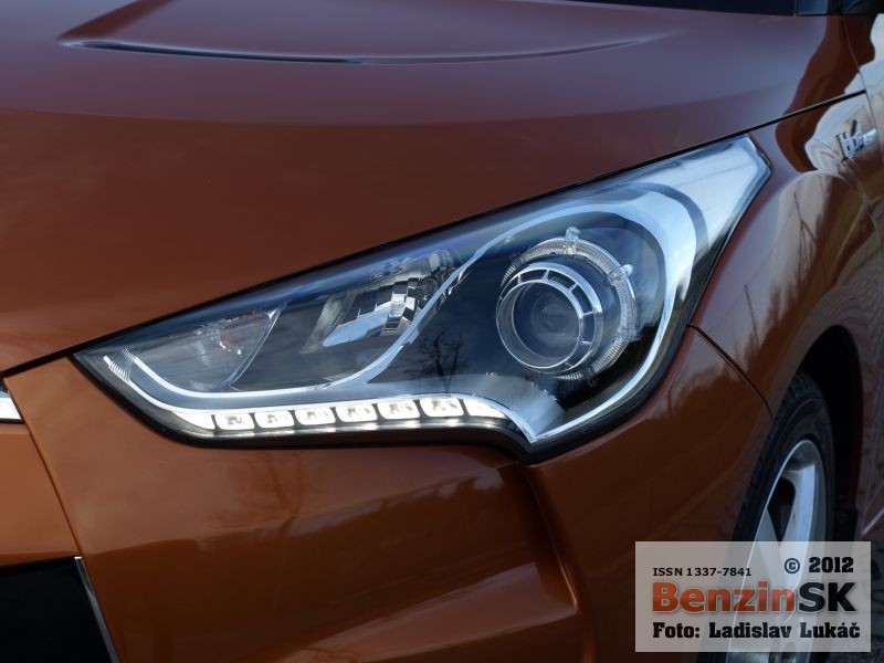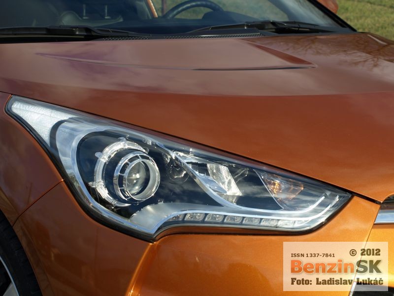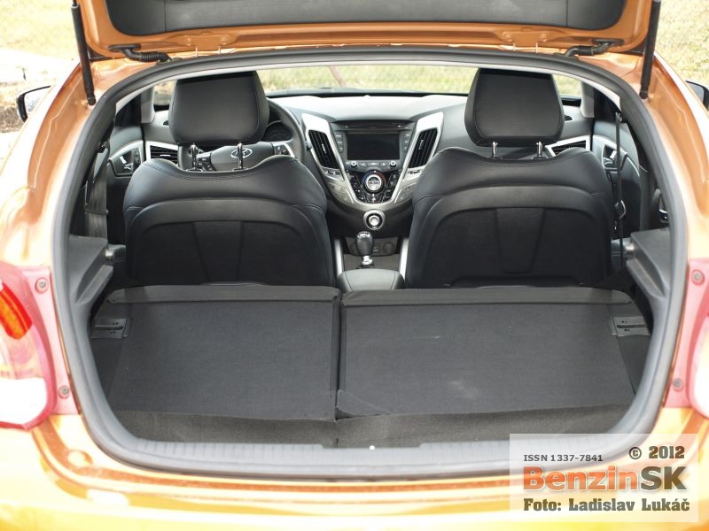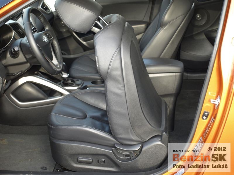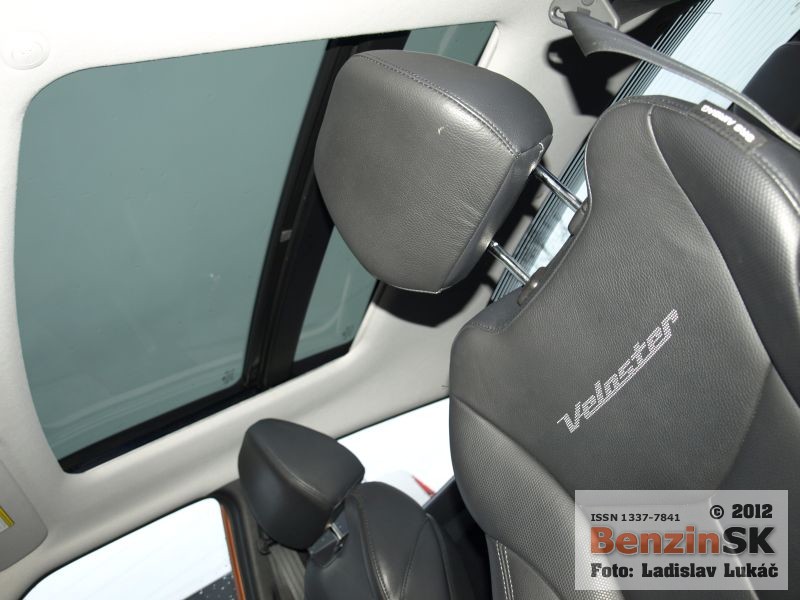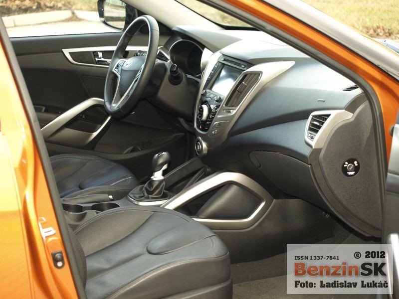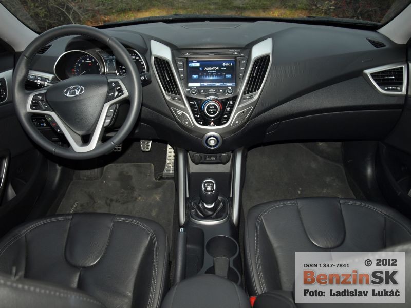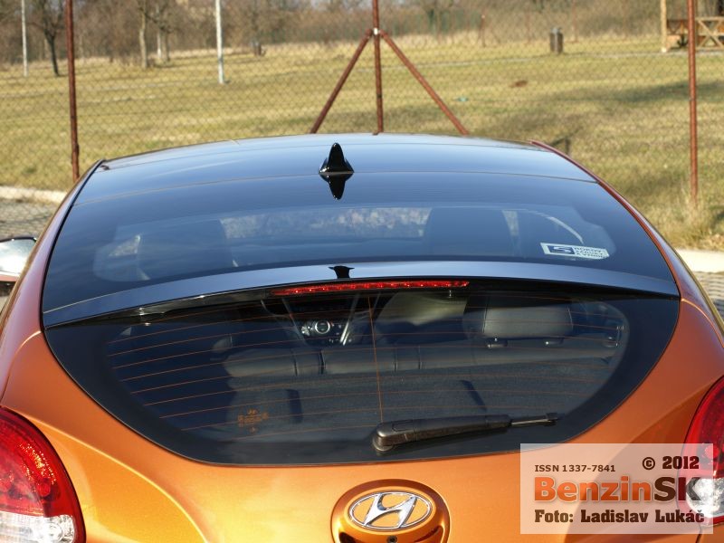 Z prednej aj zadnej strany však vyzerá Veloster rovnako a treba jedným dychom dodať, že dobre. Karoséria je viditeľne nižšia, čo podporuje myšlienku kupé a samozrejme aj športový charakter, ktorý je tiež citeľný. Športový charakter je vidieť aj v interiéri automobilu. Presklená strecha má predný diel elektricky otvárateľný, zadný je pevný a cez spojler zadných dverí plynule prechádza do zadného okna. Toto presklenie ponúka dostatok prirodzeného svetla v interiéri, samozrejme len vtedy, ak nezatiahnete nad hlavou clonu a presklenie tak zakryjete.