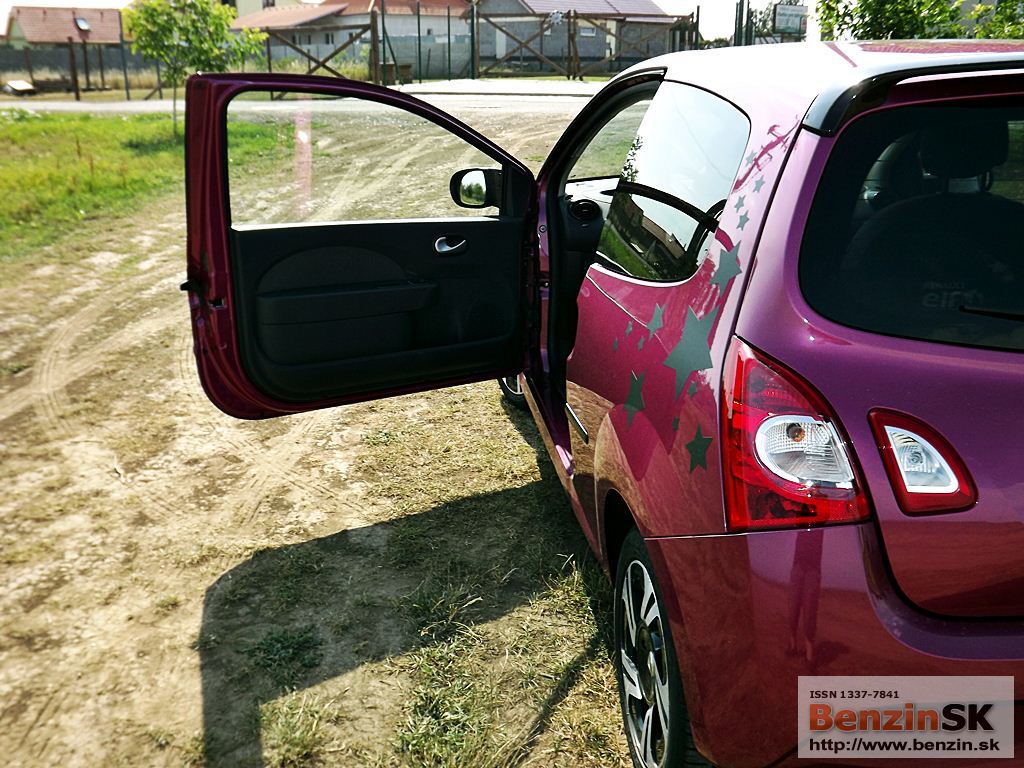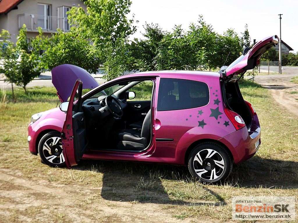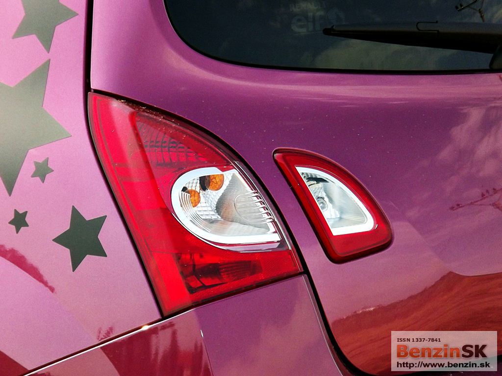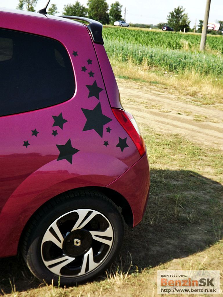 ![]() Svoje Twingo si môžete vytvoriť jedinečné, podľa svojich predstáv – stačí si vybrať z ponuky personalizačných doplnkov. I keď to nie je vždy len za symbolickú sumu, ten efekt stojí za to. My sme jazdili vo „hviezdnom“ Twingu, farba fialová fuchsia a polep strechy stál 230 eur... Predná časť nového Twinga bola inšpirovaná špeciálne novou dizajnovou identitou Renaultu. Logo Renaultu, vyskytujúce sa na kapote, je väčšie a oveľa vzpriamenejšie. Dynamický a hravý charakter Twingo je podčiarknutý hmlovými svetlometmi a oblými obrysovými svetlami, ktoré sú teraz umiestnené vedľa mriežky chladiča. Svetlomety s „očnými viečkami“ sa taktiež podieľajú na osobitom vzhľade nového Twinga. V zadnej časti sú popri bežných svietidlách umiestnené nové cúvacie svetlá, nachádzajúce sa na veku batožinového priestoru. ![]()