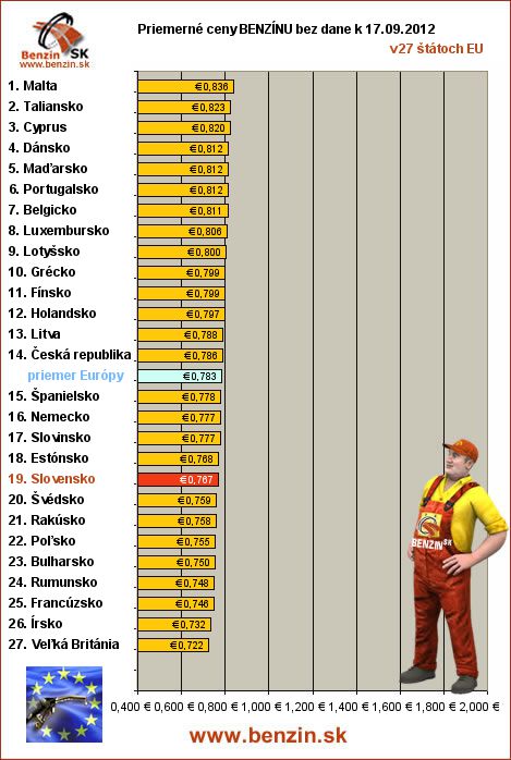 Na Slovensku sme tankovali 9. najlacnejší benzín bez dane v EÚ za priemernú cenu: 0,767 EUR za 1L.