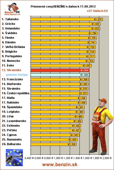 mali v Grécku, kde motoristi v priemere zaplatili 0,872 EUR za 1L.