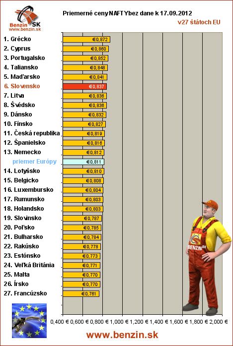 mali vo Francúzsku, kde motoristi v priemere zaplatili 0,761 EUR za 1L.