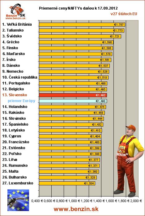 mali vo Veľkej Británií, kde motoristi v priemere zaplatili 1,787 EUR za 1L.
