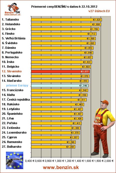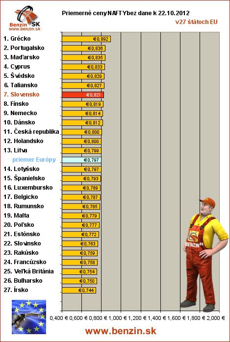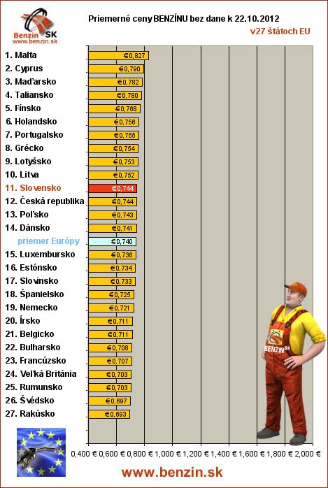 Nasledujúce údaje sú spracované podľa informácií EUROSTATU vydaných 26.10 k 22.10.2012 za obdobie v 42.týždni (od 15.10.2012 - 21.10.2012), ako ich uviedli členské štáty EU. Ceny sú uvádzané v euro. V tabuľke uvádzame štáty Európy podľa toho, za akú priemernú sumu v predchádzajúcich dňoch tankovali.