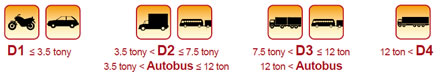 D1: motocykle, vozidlá s celkovou hmotnosťou jazdnej súpravy do 3,5 s akýmkoľvek návesom a prívesom