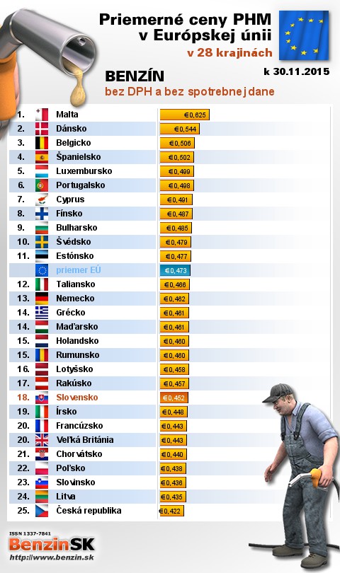 Na Slovensku sme tankovali 8. najlacnejší benzín bez dane v EÚ za priemernú cenu: 0,452 EUR za 1L.