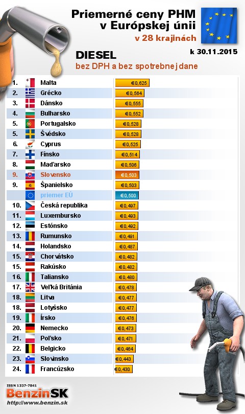 Na Slovensku čerpali motoristi 17. najlacnejšiu motorovú naftu bez dane v rámci Európy: 0,503 EUR za 1L.