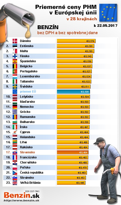 Na Slovensku sme tankovali 7. najlacnejší benzín bez dane v EÚ za priemernú cenu: 0,484 EUR za 1L.