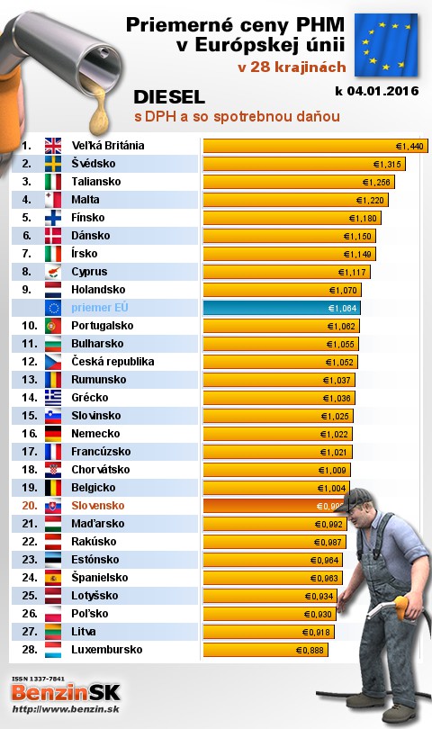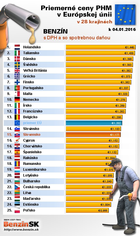 Nasledujúce údaje sú spracované podľa informácií EUROSTATU vydaných 07.01 k 04.01.2016 za obdobie v 0.týždni (od 28.12.2015 - 03.01.2016), ako ich uviedli členské štáty EU. Ceny sú uvádzané v euro. V tabuľke uvádzame štáty Európy podľa toho, za akú priemernú sumu v predchádzajúcich dňoch tankovali.