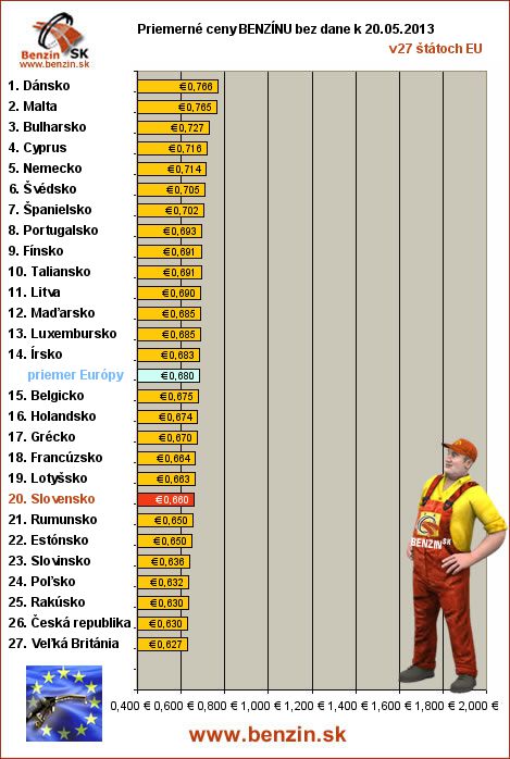 Na Slovensku sme tankovali 8. najlacnejší benzín bez dane v EÚ za priemernú cenu: 0,660 EUR za 1L.