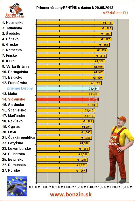 mali v Holandsku, kde motoristi v priemere zaplatili 1,728 EUR za 1L.