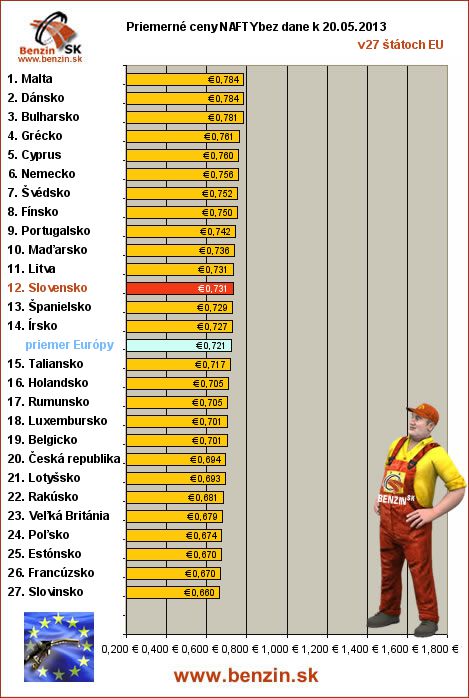mali na Malte, kde motoristi v priemere zaplatili 0,784 EUR za 1L.