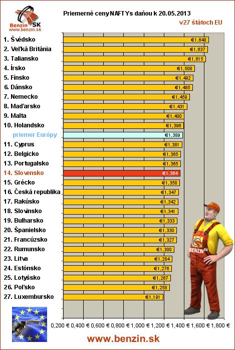 mali v Veľká Británii, kde motoristi v priemere zaplatili 0,627 EUR za 1L.