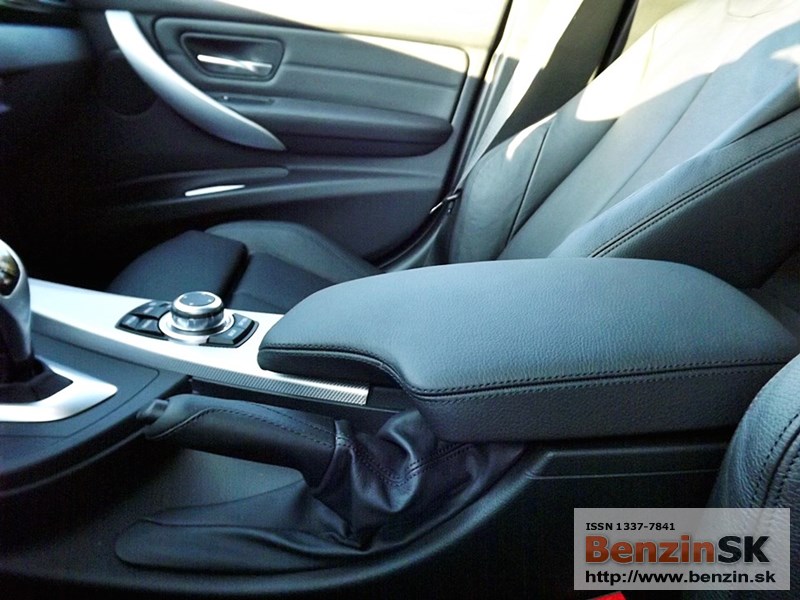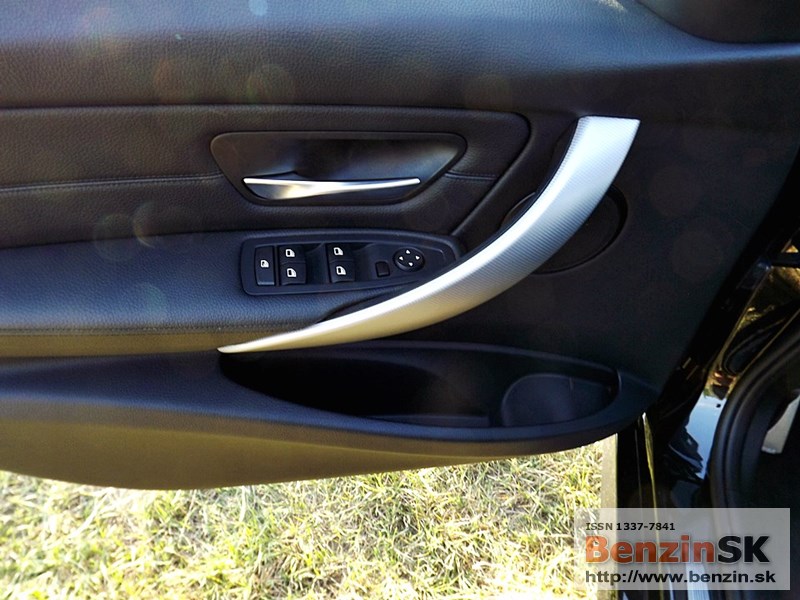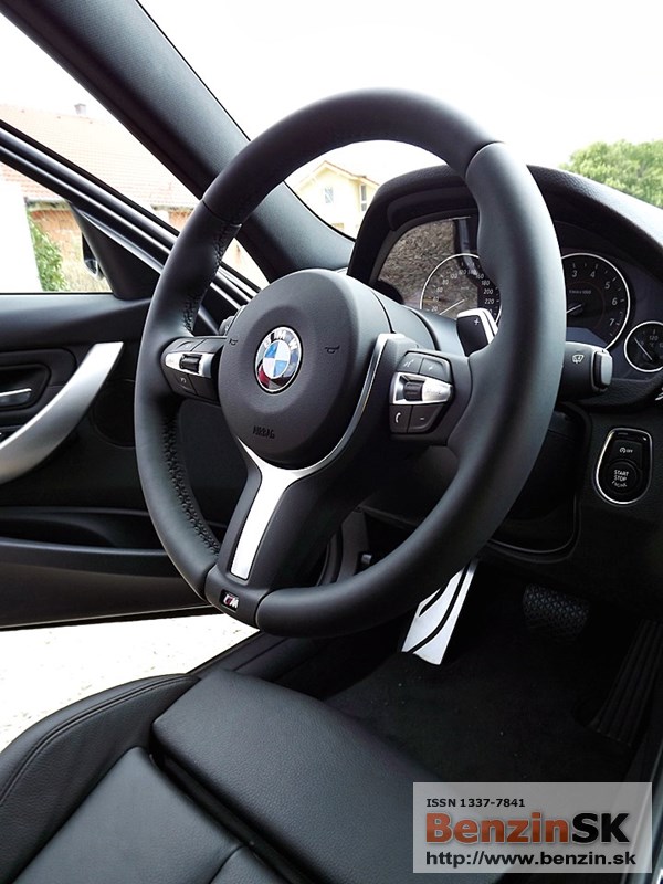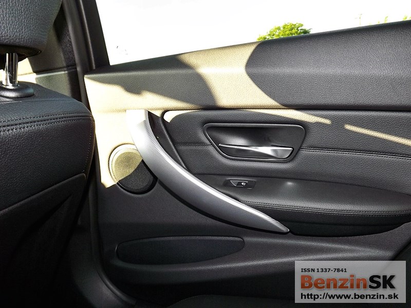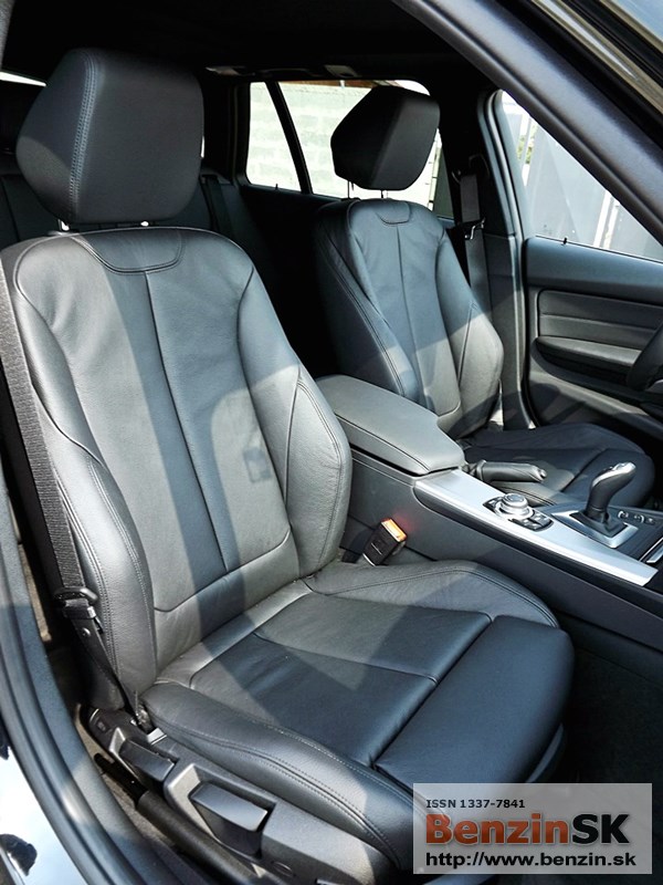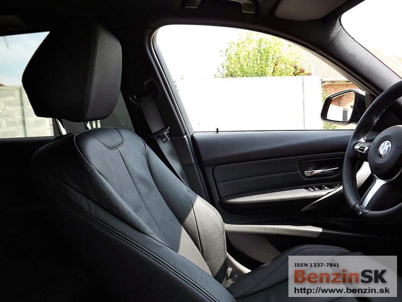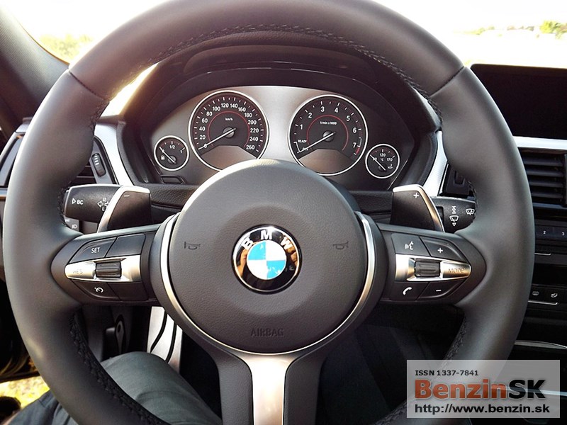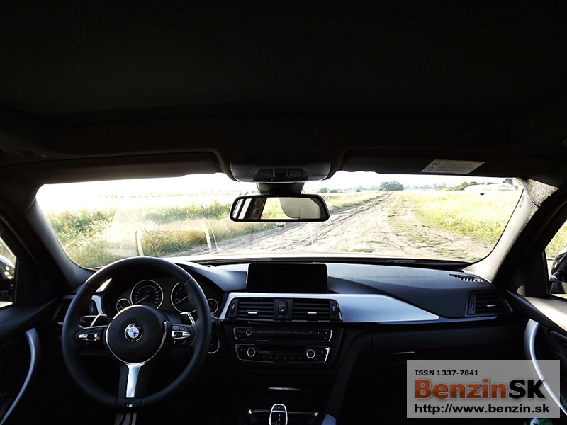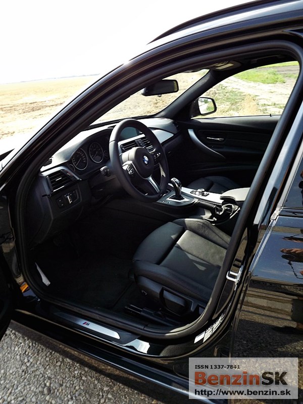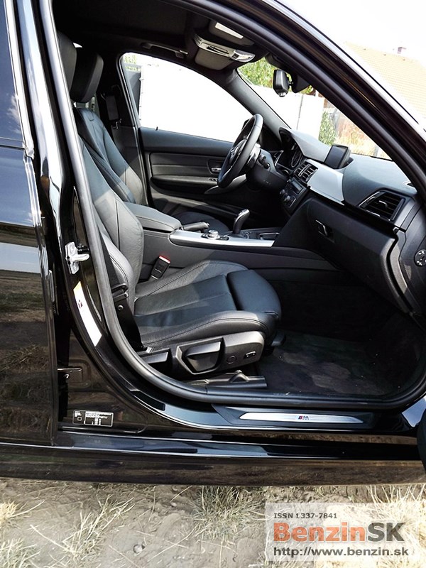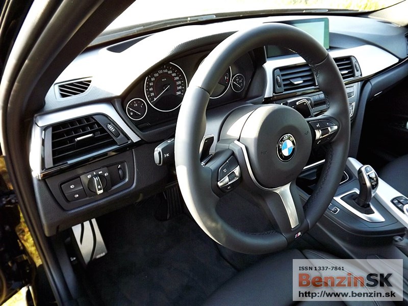 V interiéri má BMW radu 3 M Sport kožený volant s multifunkčným ovládaním, športové sedadlá, kožené čalúnenia. Logo M zdobí aj prahové lišty a odkladaciu plochu pre nohu pri pedáloch. Na volante vľavo je ovládač tempomatu, napravo ovládanie rádia a handsfree.