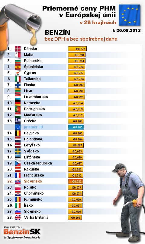 Na Slovensku sme tankovali 7. najlacnejší benzín bez dane v EÚ za priemernú cenu: 0,682 EUR za 1L.