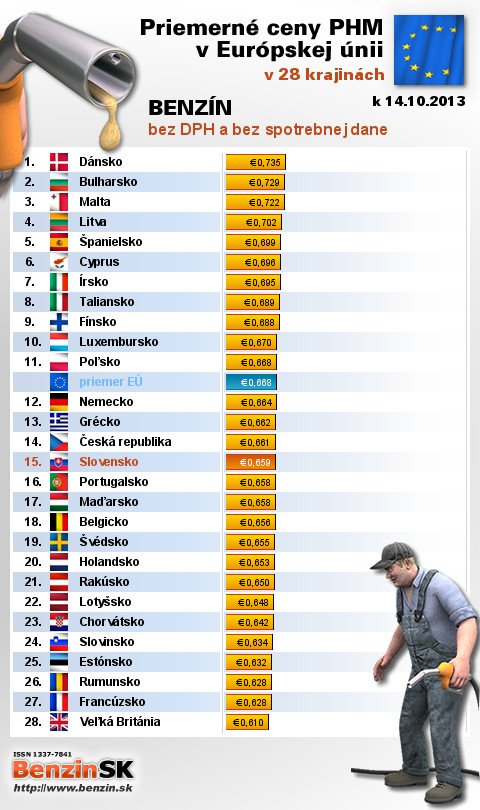 Na Slovensku sme tankovali 14. najlacnejší benzín bez dane v EÚ za priemernú cenu: 0,659 EUR za 1L.
