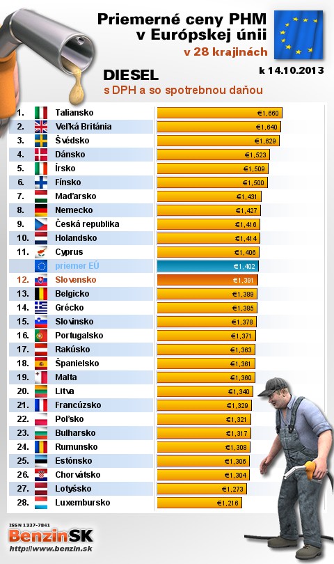 Na Slovensku čerpali motoristi 12. najdrahšiu motorovú naftu s daňou v rámci Európy: 1,391 EUR za 1L.