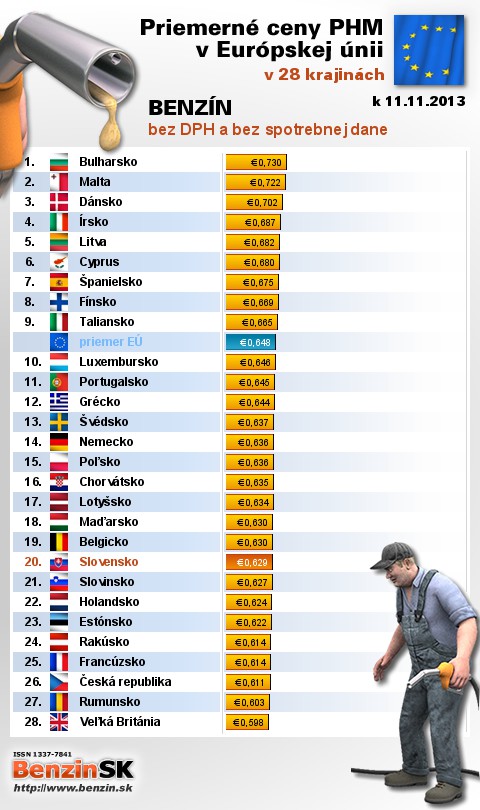 Na Slovensku sme tankovali 9. najlacnejší benzín bez dane v EÚ za priemernú cenu: 0,629 EUR za 1L.