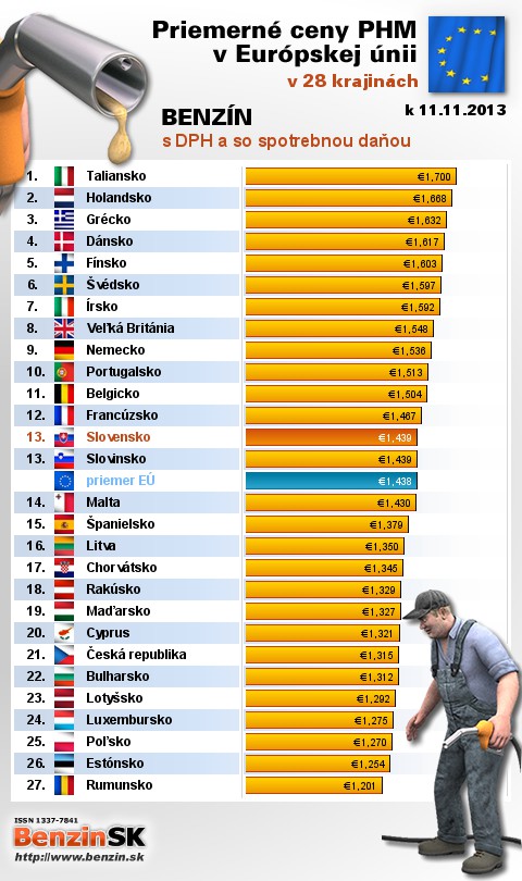 Na Slovensku sme tankovali 13. najdrahší benzín s daňou v EÚ za priemernú cenu: 1,439 EUR za 1L.