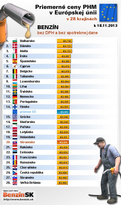 Na Slovensku sme tankovali 9. najlacnejší benzín bez dane v EÚ za priemernú cenu: 0,631 EUR za 1L.