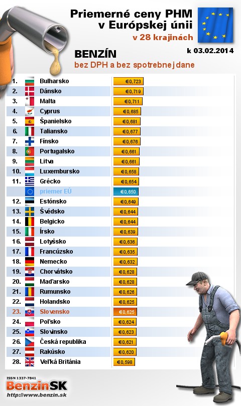 Na Slovensku sme tankovali 6. najlacnejší benzín bez dane v EÚ za priemernú cenu: 0,625 EUR za 1L.