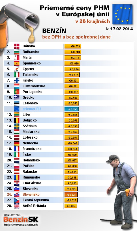 Nasledujúce údaje sú spracované podľa informácií EUROSTATU vydaných 20.02 k 17.02.2014 za obdobie v 7.týždni (od 10.02.2014 - 16.02.2014), ako ich uviedli členské štáty EU. Ceny sú uvádzané v euro. V tabuľke uvádzame štáty Európy podľa toho, za akú priemernú sumu v predchádzajúcich dňoch tankovali.