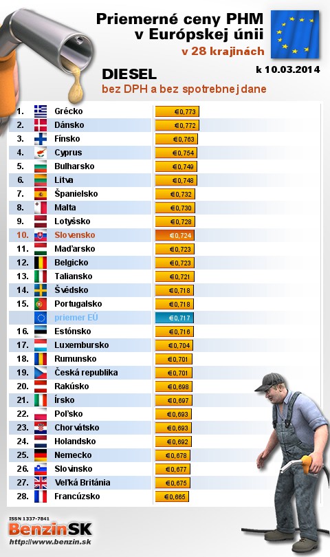 Na Slovensku čerpali motoristi 19. najlacnejšiu motorovú naftu bez dane v rámci Európy: 0,724 EUR za 1L.