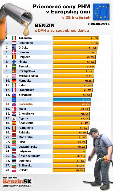 Na Slovensku sme tankovali 14. najdrahší benzín s daňou v EÚ za priemernú cenu: 1,476 EUR za 1L.