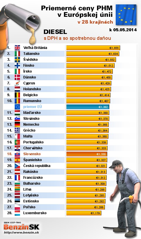 Na Slovensku čerpali motoristi 18. najdrahšiu motorovú naftu s daňou v rámci Európy: 1,330 EUR za 1L.