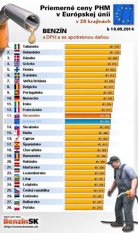 Na Slovensku sme tankovali 13. najdrahší benzín s daňou v EÚ za priemernú cenu: 1,482 EUR za 1L.