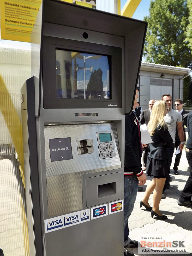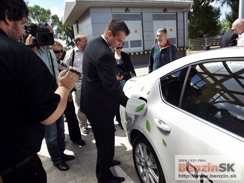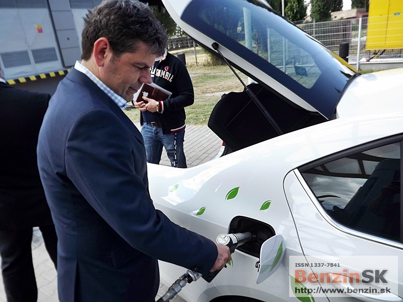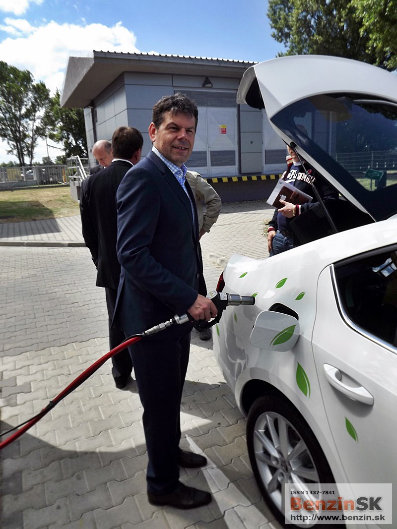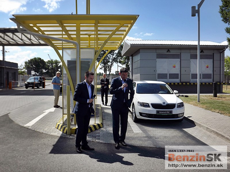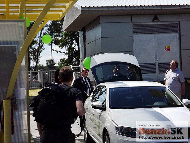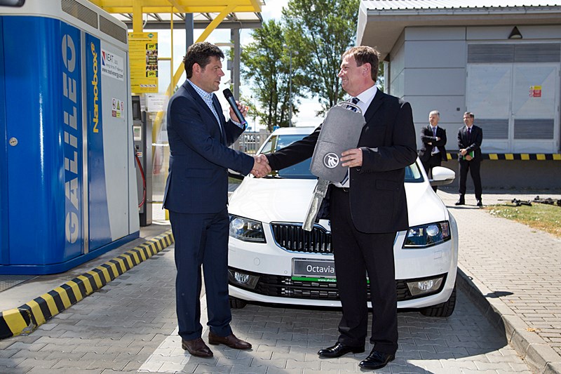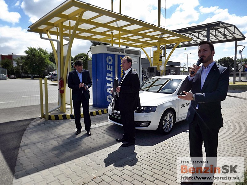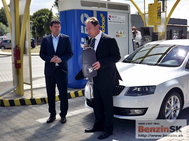 ![]() Ing. Karel Sklenář, konateľ spoločnosti ŠKODA AUTO Slovensko, odovzdal symbolický kľúč od auta Ing. Ľubomírovi Blaškovi, riaditeľovi spoločnosti SPP CNG